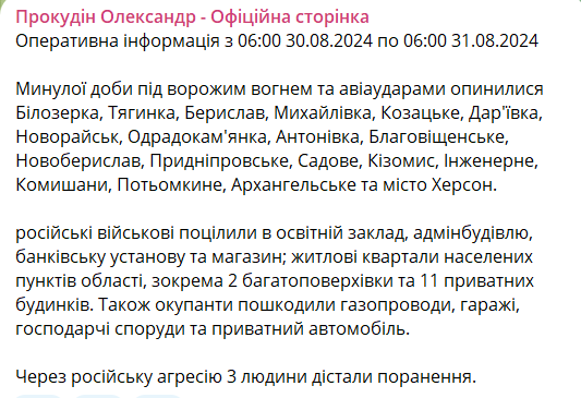 Минулої доби під ворожим вогнем та авіаударами опинилися Білозерка, Тягинка, Берислав, Михайлівка, Козацьке, Даріївка, Новорайськ, Одрадокам'янка, Антонівка, Благовіщенське, Новоберислав, Придніпровський, Садовий, Кізоміс, Інженерний, Комішани.