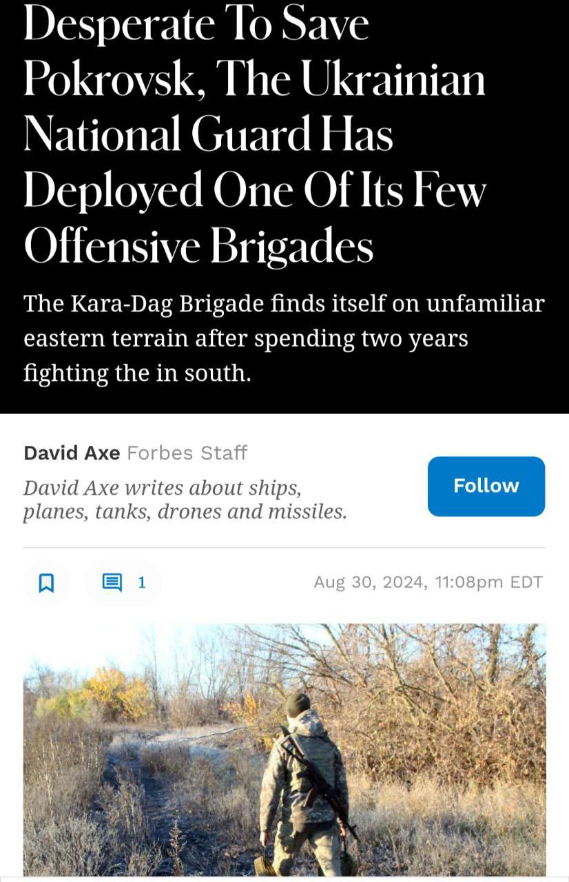 "Переміщення бригади з її звичайних позицій на півдні України на незнайоме поле бою на сході наголошує на терміновості проблем України між Авдіївкою та Покровськом. Коли просування росіян у серпні прискорилося, генеральний штаб у Києві, нарешті, щось із цим зробив. Він направив на Покровське направлення частина підкріплення, щоб приєднатися до півдесятка механізованих, десантно-штурмових бригад та бригад Нацгвардії, які вже були на цьому напрямі", - йдеться у повідомленні.