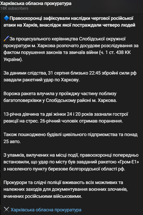 А вчора ввечері росіяни завдали ракетного удару по Харкову. Постраждали чотири особи. Про це повідомляє Харківська прокуратура.