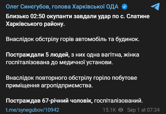 "Близько 02:50 окупанти завдали удару по с. Слатиному Харківського району. Внаслідок обстрілу горів автомобіль та будинок", - написав він.