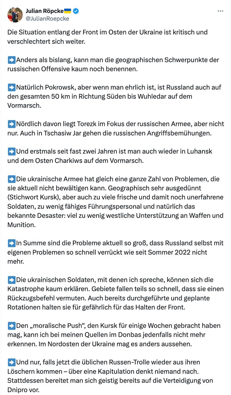 "Українські солдати, з якими я розмовляю, ледве можуть зрозуміти катастрофу, що відбувається. Території іноді втрачаються настільки швидко, начебто було віддано наказ на відступ. Вже проведені та заплановані ротації вони також вважають небезпечними для утримання фронту", - пише Репке.