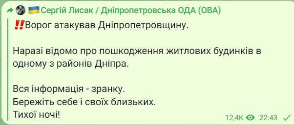 22.46 Внаслідок вибухів у Дніпрі пошкоджено житловий будинок, повідомляє голова ОВА Лисак.