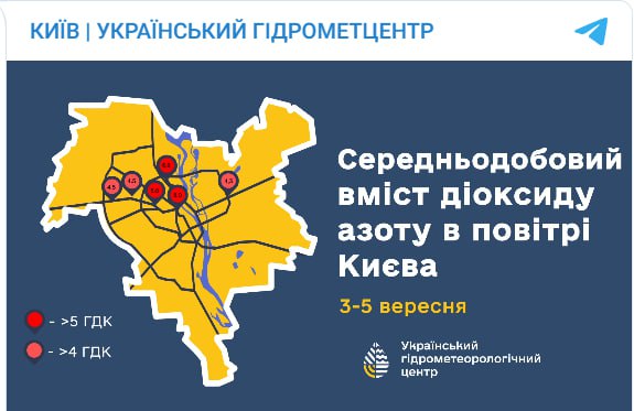 Метеорологи фіксують, що протягом 3-5 вересня рівень забруднення діоксидом азоту досяг 5-8 середньодобових гранично допустимих концентрацій у районах: Бессарабській, Галицькій площ, вулиць Довженка, Каунаської, Скляренка, Берестейського проспекту.