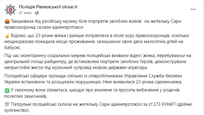 У Сарнах Рівненщини покарали 23-річну матір двох дітей, яка крутилася і показувала середній палець під матюки російського репу на тлі портретів загиблих українських військових.