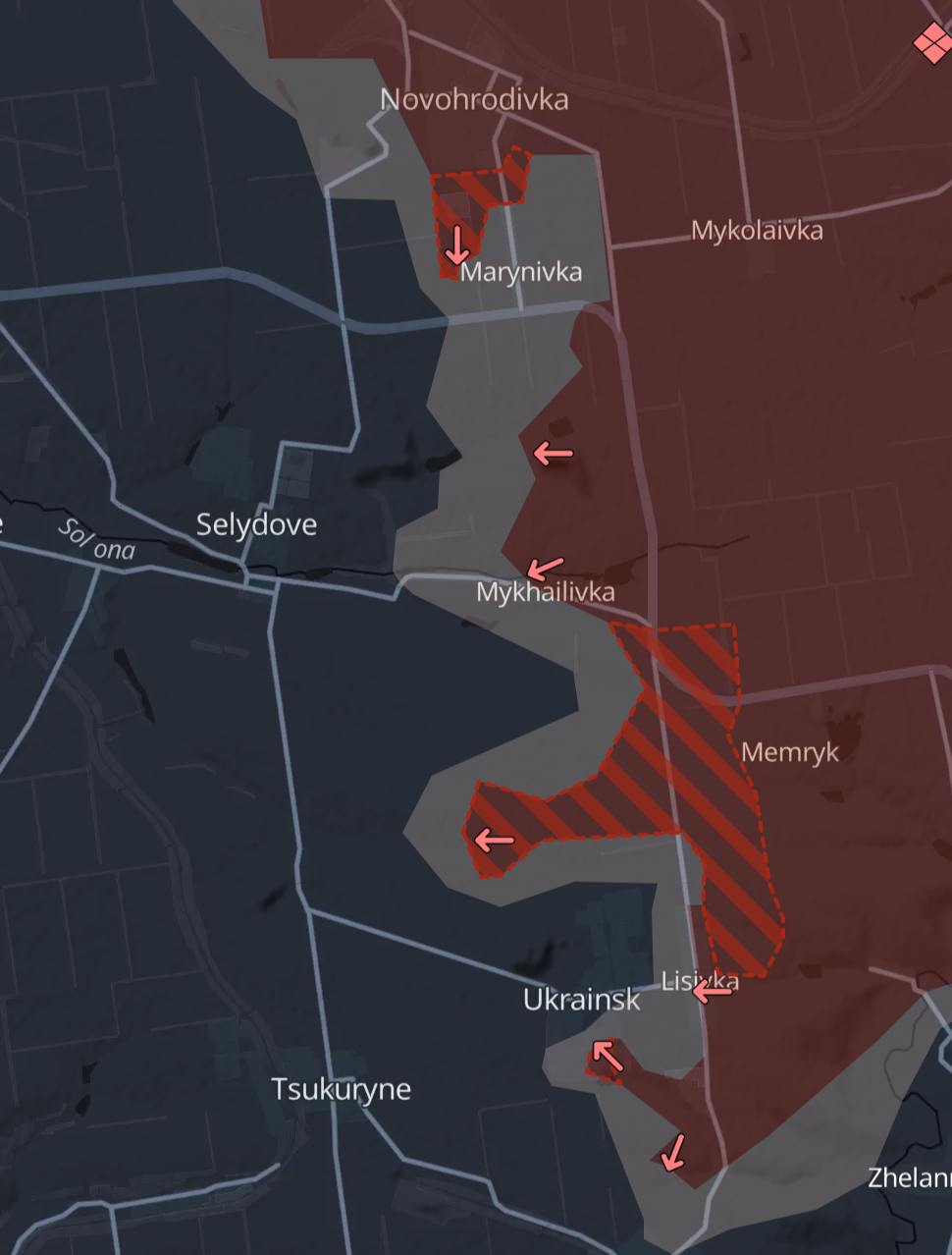 Вони пройшли більш ніж на три кілометри на захід з боку Мемрика, вклинившись між Селидовим та Україном. Також росіяни просунулися в самому Українці та в селі Маринівка на північ від Селідово, повідомляє український військовий паблік Deep State.