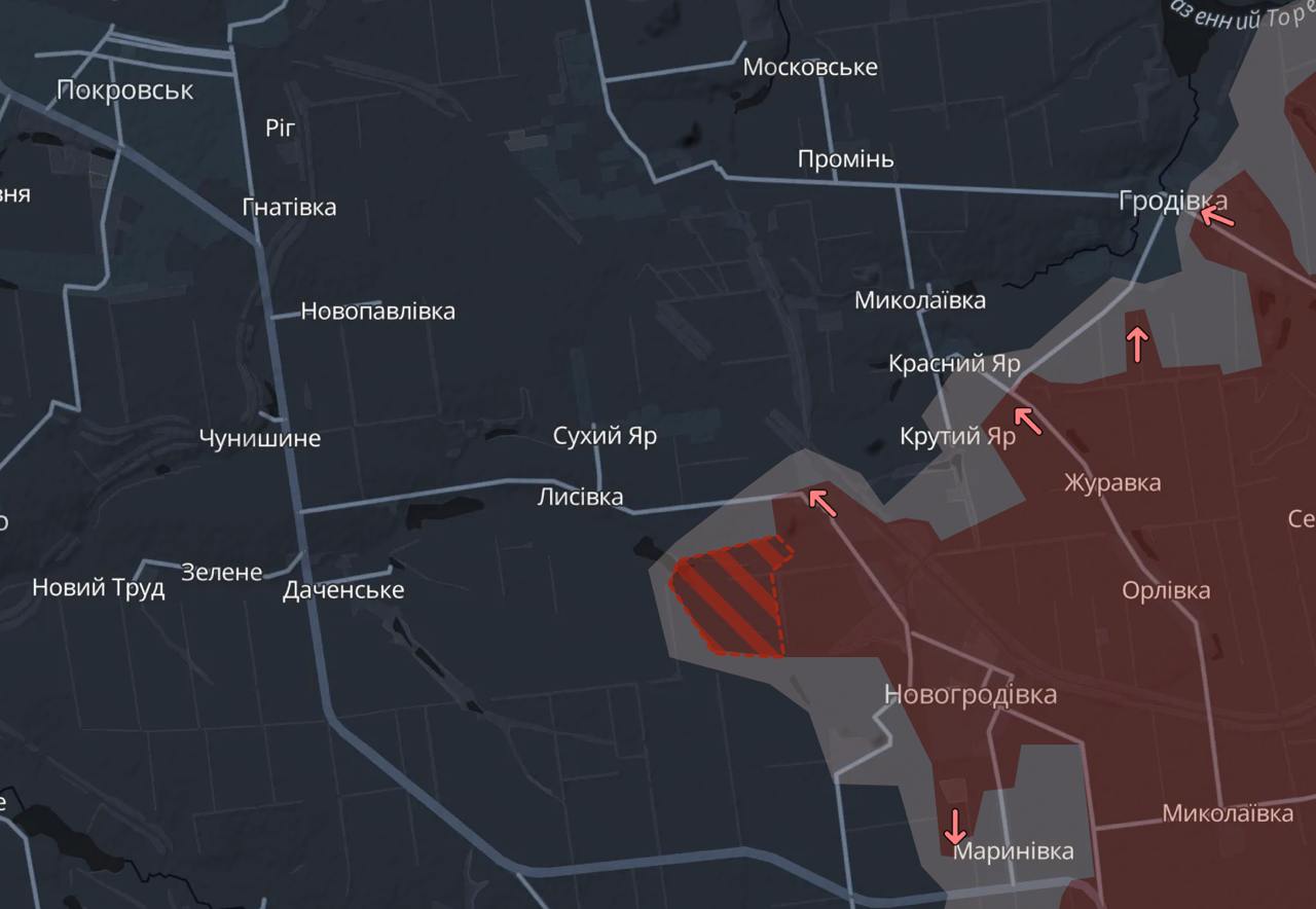Також Deep State фіксує новий поступ на захід від Новогродівки - приблизно півтора кілометри у бік Лисівки. Це вже напрямок прямо на Покровськ.