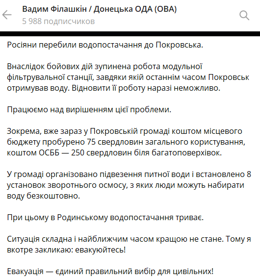 Також перебито водопостачання Покровська - через обстріл зупинено роботу модульної фільтрувальної станції, повідомляє Донецька обласна військова адміністрація.