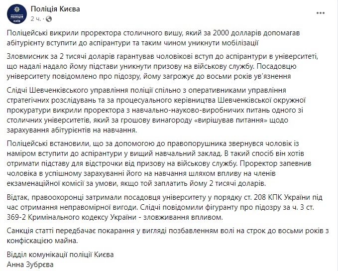 Проректорові загрожує 8 років ув'язнення. Фото: facebook.com/UA.KyivPolice