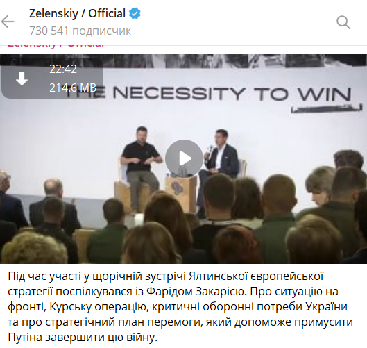 Про це Зеленський сказав у розмові із журналістом Фарідом Закарією під час XX щорічної зустрічі Ялтинської європейської стратегії.