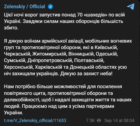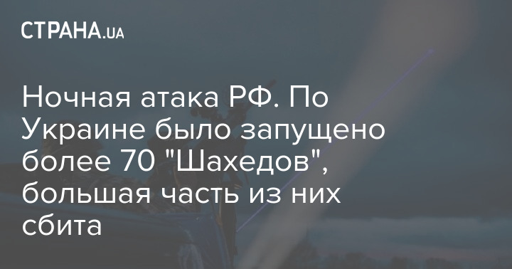 Вночі Україною було запущено понад 70 "Шахедів", більша частина з них збита. Про це повідомив президент Володимир Зеленський.