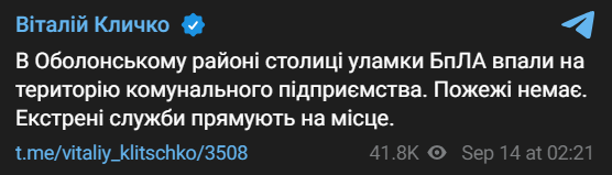 Мер Києва Віталій Кличко повідомив, що в столиці уламки БПЛА впали на територію комунального підприємства в Оболонському районі.