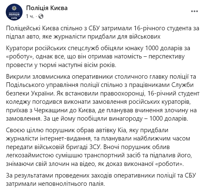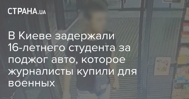 Поліцейські Києва спільно із СБУ затримали 16-річного студента за підпал автомобіля, який журналісти придбали для військових.