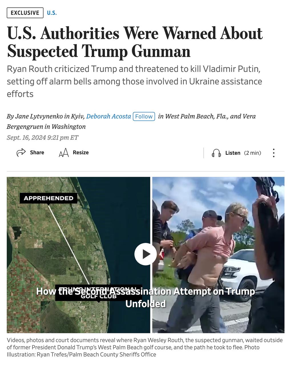 Підозрюваний у замаху на Трампа погрожував убити Путіна та Кім Чен Іна - The Wall Street Journal