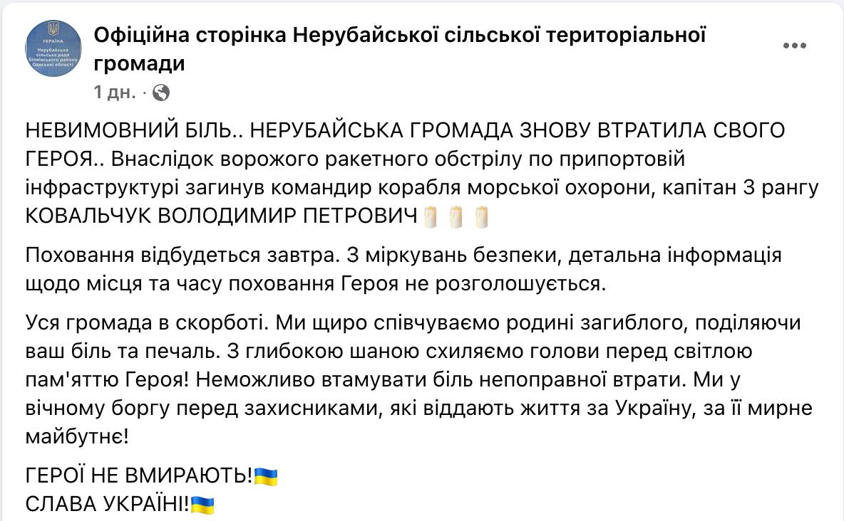 14.54 Внаслідок ракетного обстрілу загинув командир корабля морської охорони, капітан 3-го рангу Володимир Ковальчук.