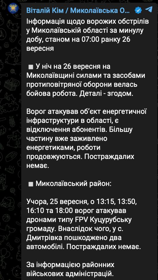 8.37 У Миколаївській області також під удар потрапила енергетика, повідомила влада регіону.