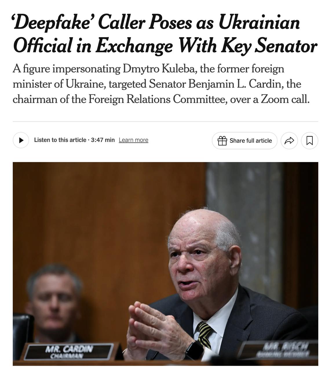 Американського сенатора від штату Меріленд із Демократичної партії Бенджаміна Кардіна намагалися обдурити за допомогою дипфейк-технології, зателефонувавши йому від імені Дмитра Кулеби.