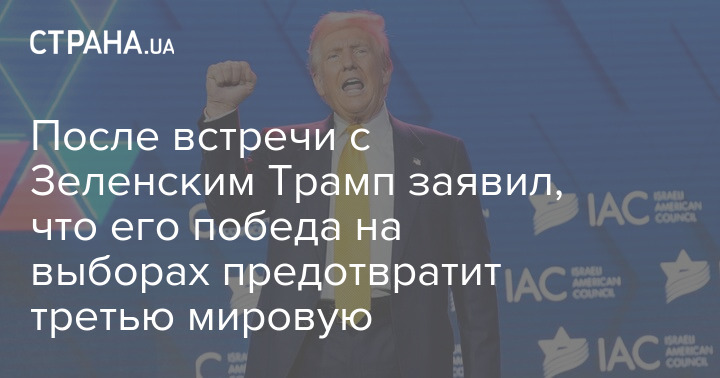Після зустрічі з Володимиром Зеленським кандидат у президенти США Дональд Трамп заявив, що його перемога на виборах допоможе запобігти третій світовій війні.