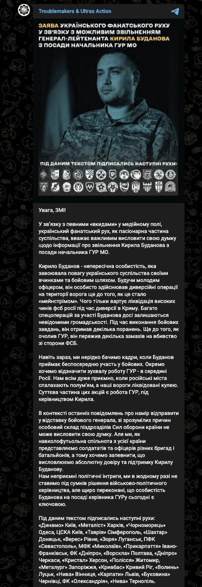 Побічно їх підтверджує "група підтримки" Буданова, яка вимагає не звільняти голову ГУР. Спеціальне звернення записали фанати найбільших українських футбольних клубів, включаючи "Динамо Київ", "Шахтар", "Чорноморець" та інші.