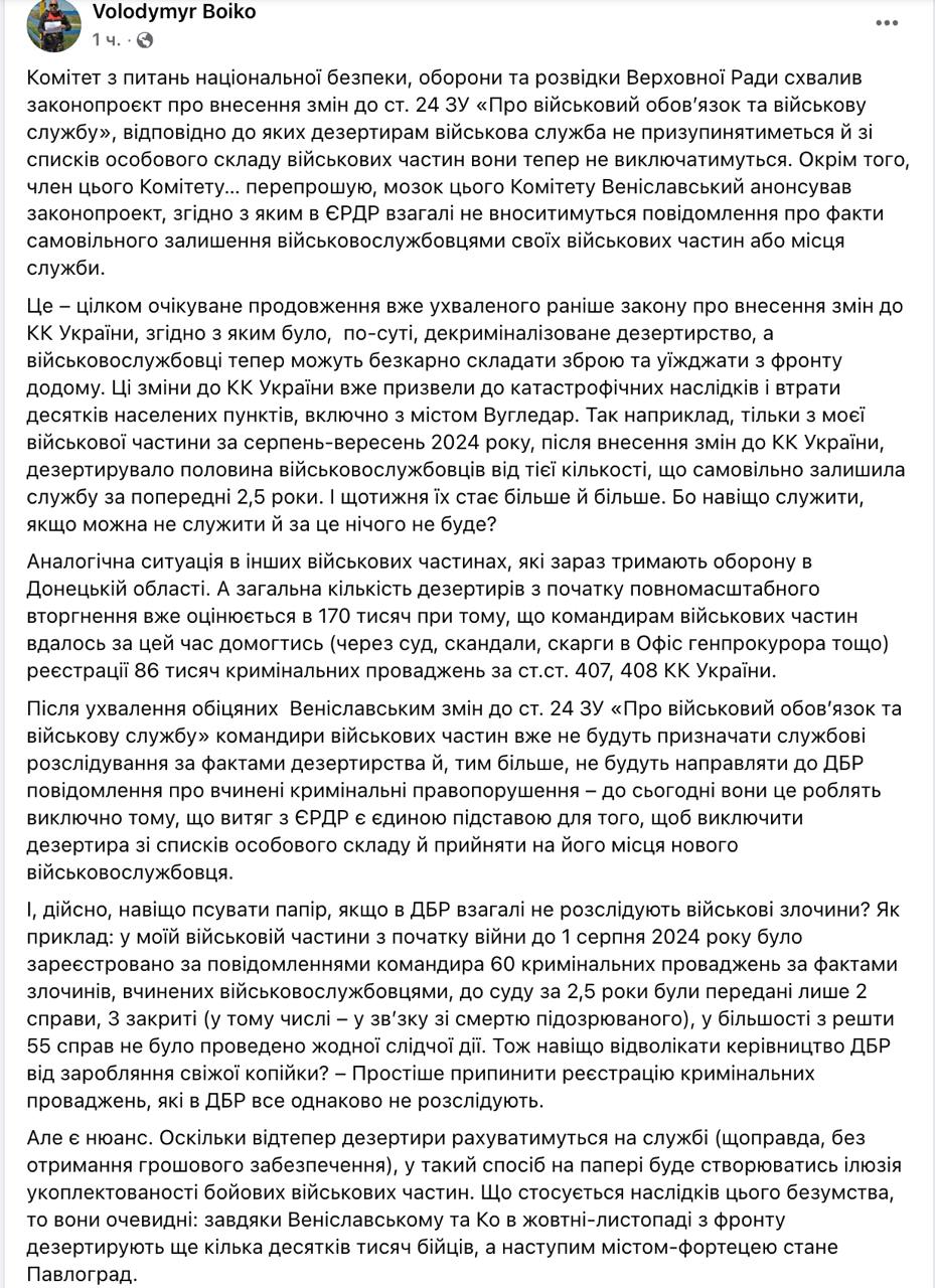 "Тільки з моєї військової частини за серпень-вересень 2024 року, після внесення змін до КК України, дезертувала половина військовослужбовців від тієї кількості, яка самовільно залишила службу за попередні 2,5 роки. І щотижня їх стає більше і більше. Бо навіщо служити, якщо можна не служити і за це нічого не буде?" – пише Бойко.