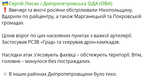 08:16 Увечері та вночі росіяни обстрілювали Нікопольщину. Вдарили по райцентру, а також по Марганецькій та Покровській громадах.