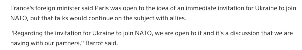 Раніше міністр-делегат з питань Європи Бенжамен Хаддад заявляв, що Франція намагається переконати НАТО у необхідності негайного ухвалення України до Альянсу.