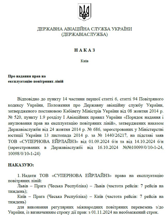 У наказі сказано, що логістична компанія отримала право на експлуатацію повітряних ліній Львів-Прага-Львів та Київ-Прага-Київ.