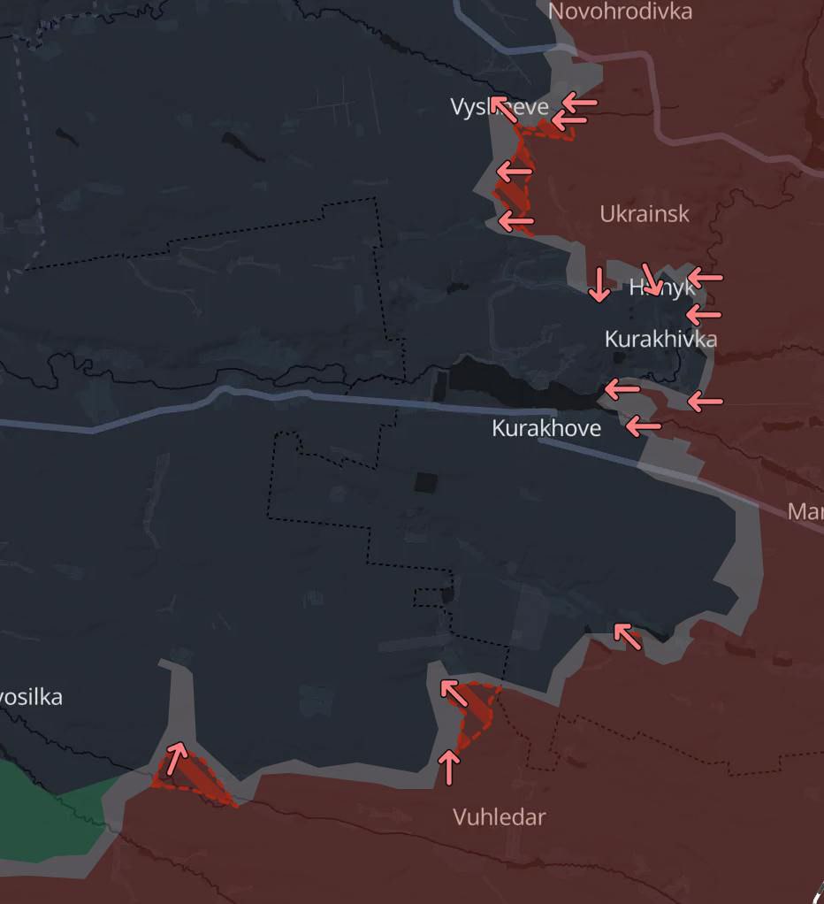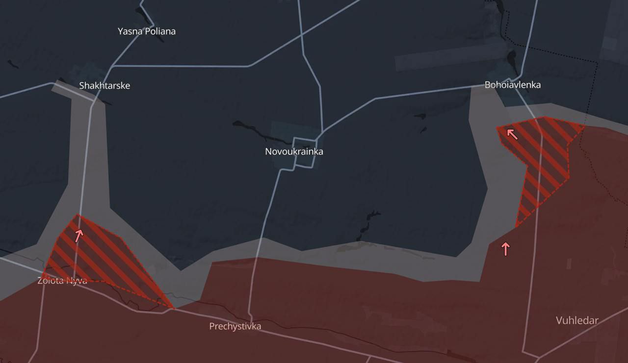 Про наступ на Новодмитрівку повідомляють і російські пабліки. Вони заявляють про просування до двох кілометрів з півночі на південь трасою від Вишневого. Мета, як заявляється - вийти з північного заходу до тилу угруповання ЗСУ у Кураховому та всього району на південь від нього.