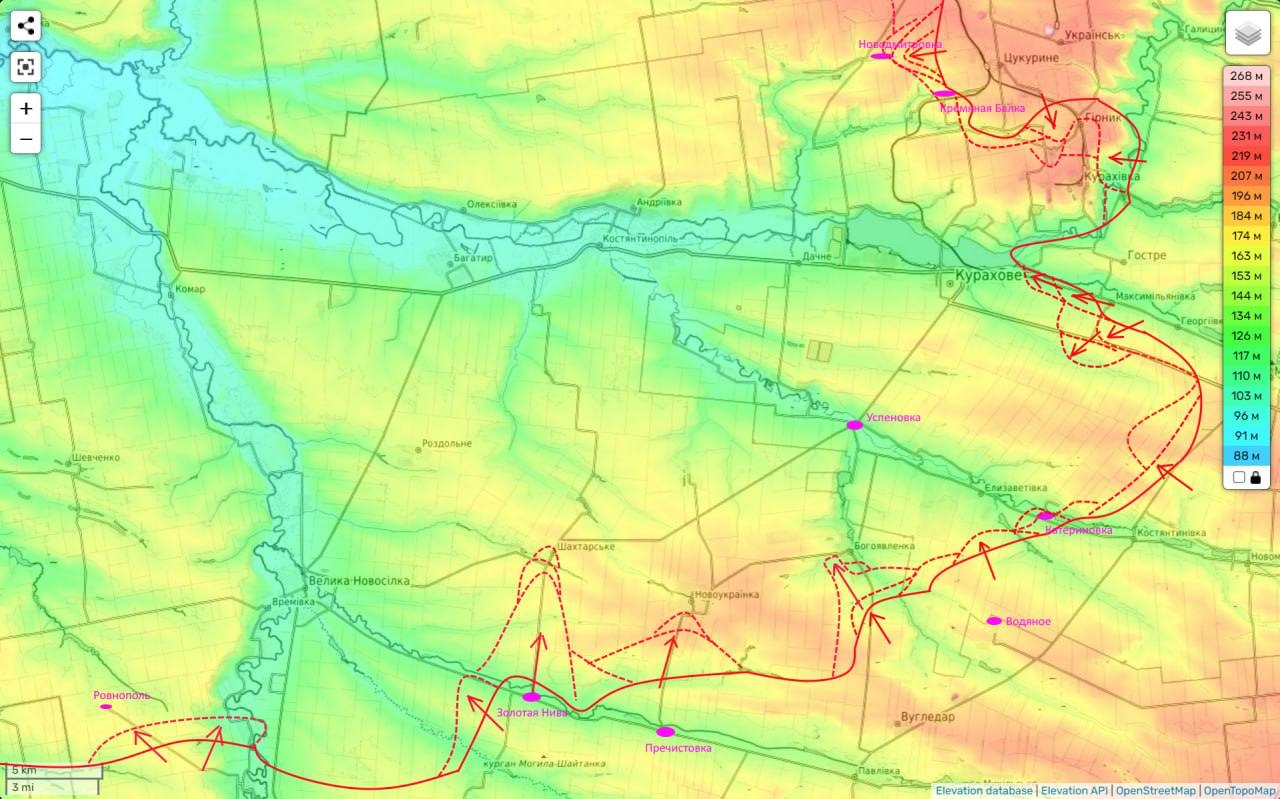 Раніше ми аналізували, що наступ РФ з півдня при одночасних ударах з півночі може становити загрозу для всіх сил ЗСУ на південний захід від Донецька, і особливо для Курахового.