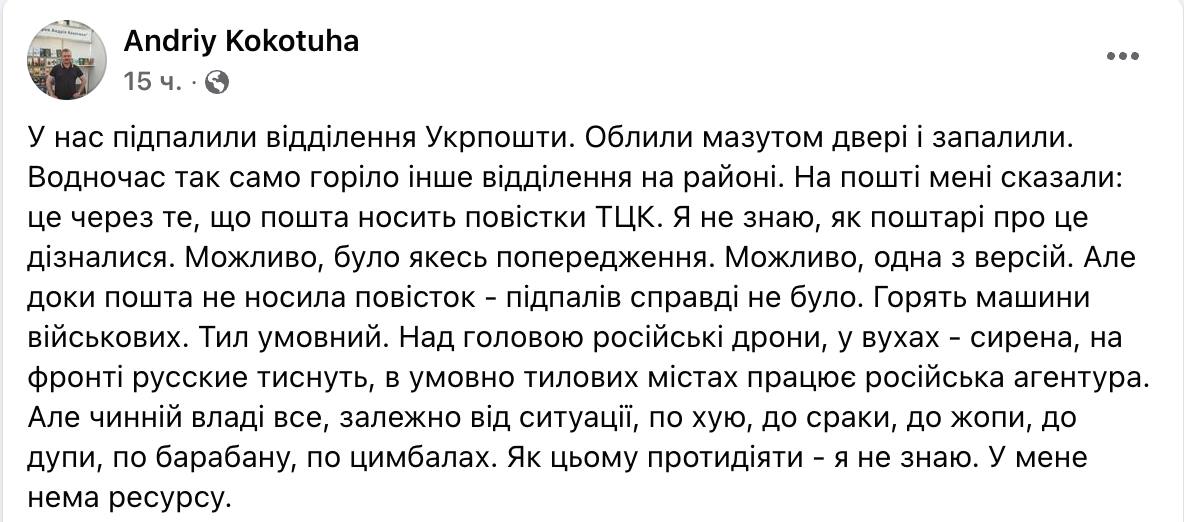 "Облили мазутом двері та запалили. На пошті мені сказали: це через те, що пошта носить повістки ТЦК. Я не знаю, як листоноші про це дізналися. Можливо, було якесь попередження. Можливо, одна з версій. Але поки що пошта не носила повісток - підпалів справді не було", - пише Кокотюха.