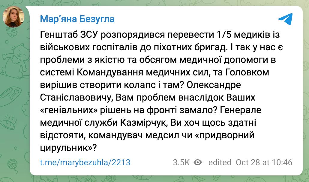 "І так у нас є проблеми з якістю та обсягом медичної допомоги в системі Командування медичних сил та Головком вирішив створити колапс і там?" - пише Безугла.