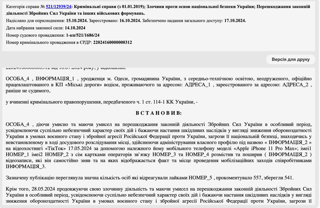 Малиновський райсуд Одеси дав чоловікові 5 років в'язниці з випробувальним терміном на 1 рік за публікацію у Тік-Ток відео, на яких співробітники ТЦК проводили "мобілізаційні заходи".