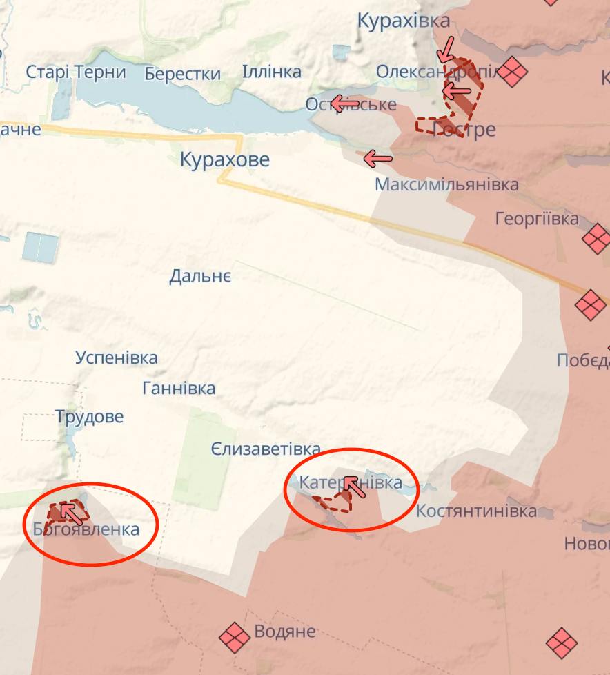 8.28 Російські війська просунулися за три місця на південь від Курахового - у Ясної Поляни, Богоявленки та Катеринівки, повідомляє український військовий паблік Deep State.