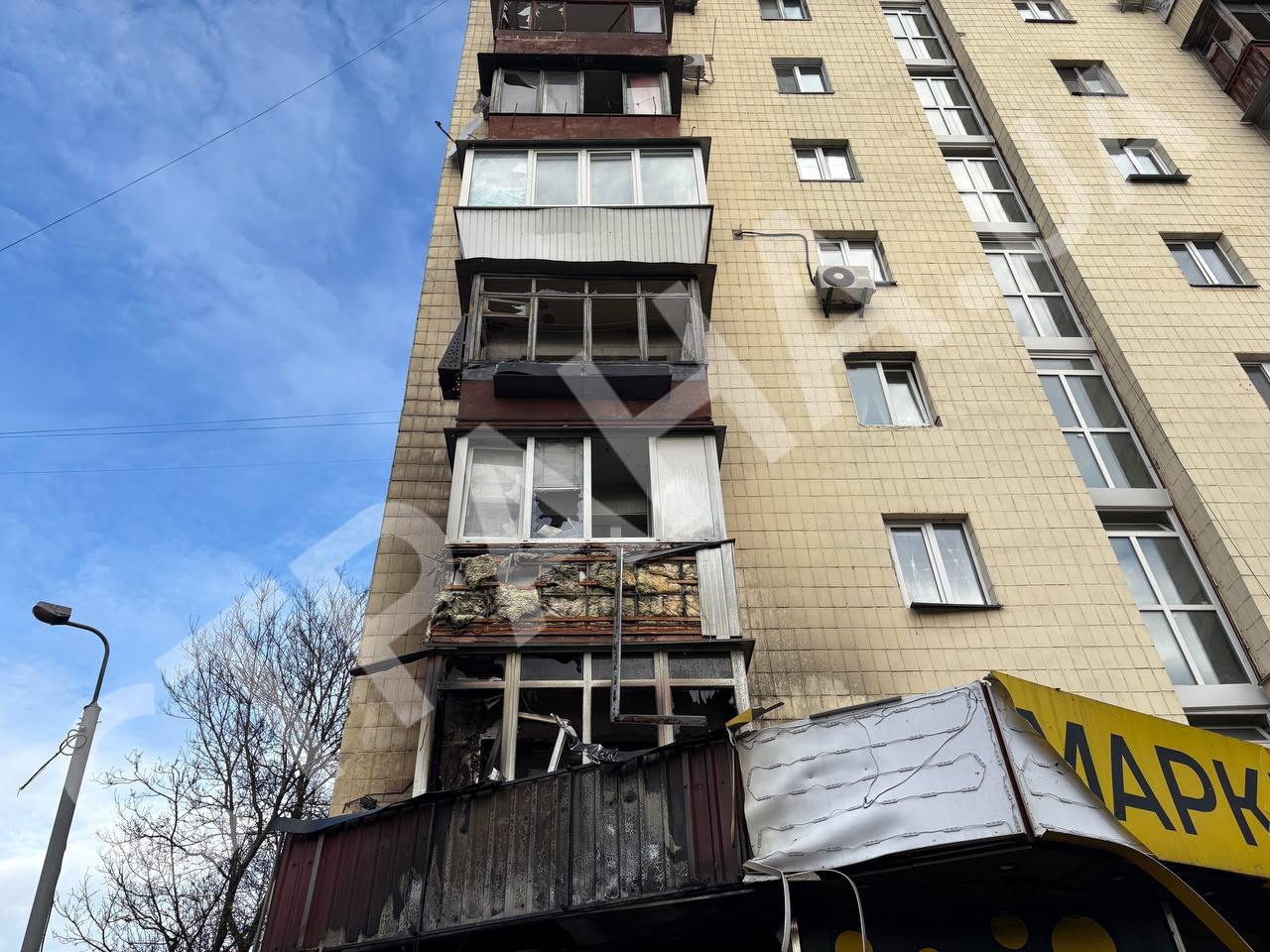 У Солом'янському районі столиці постраждала багатоповерхівка, спалахнув газопровід, магазин і автомобілі, що стояли поряд. П'ятеро людей постраждали.