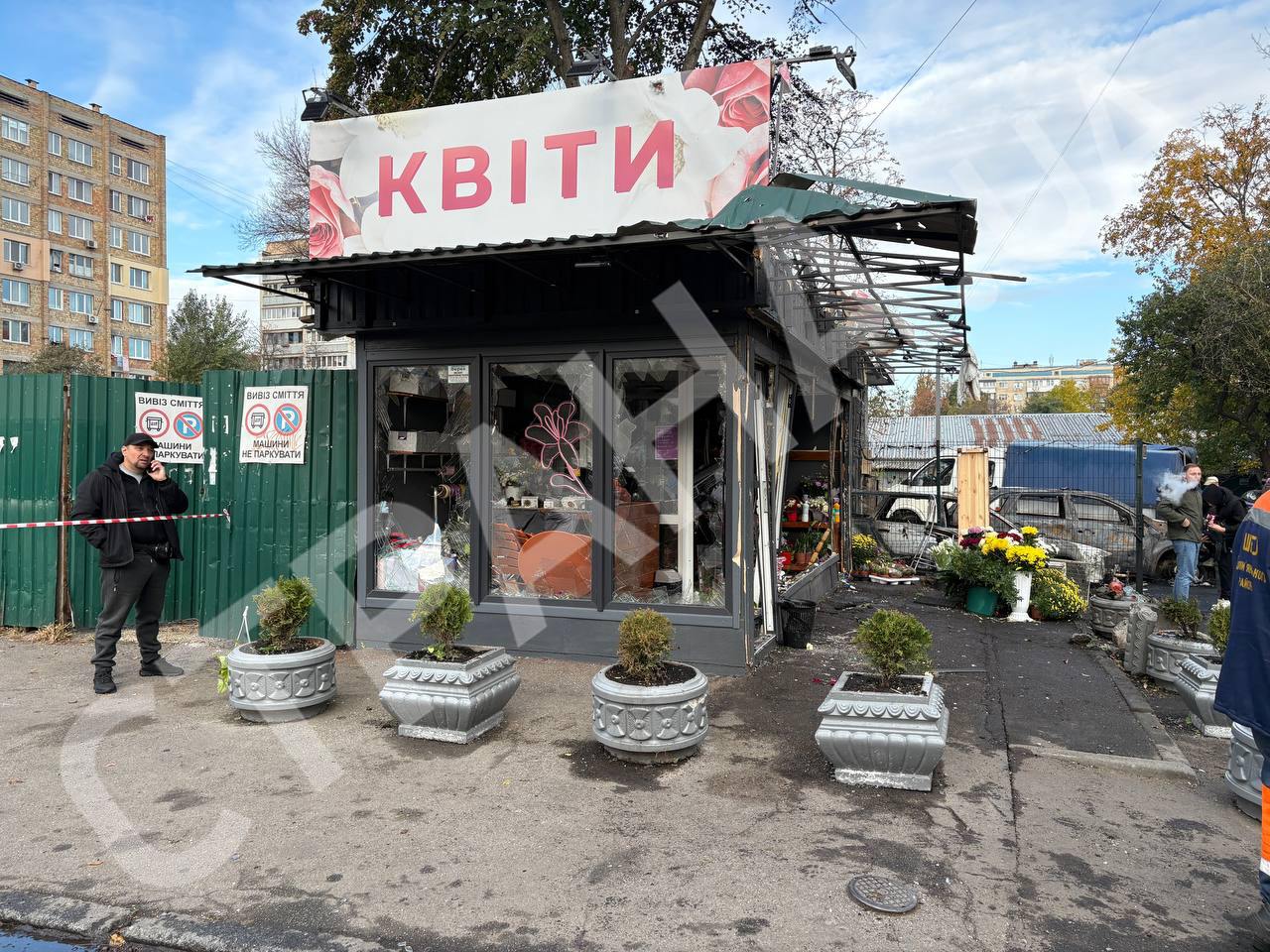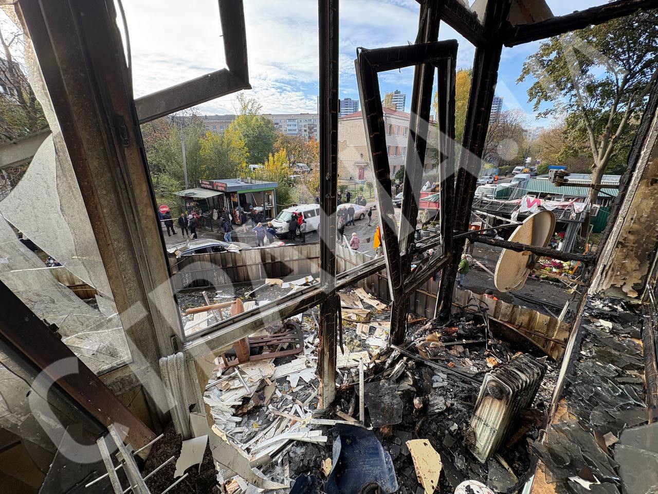9.30 Нові кадри з місця падіння уламків у Солом'янському районі Києва.
