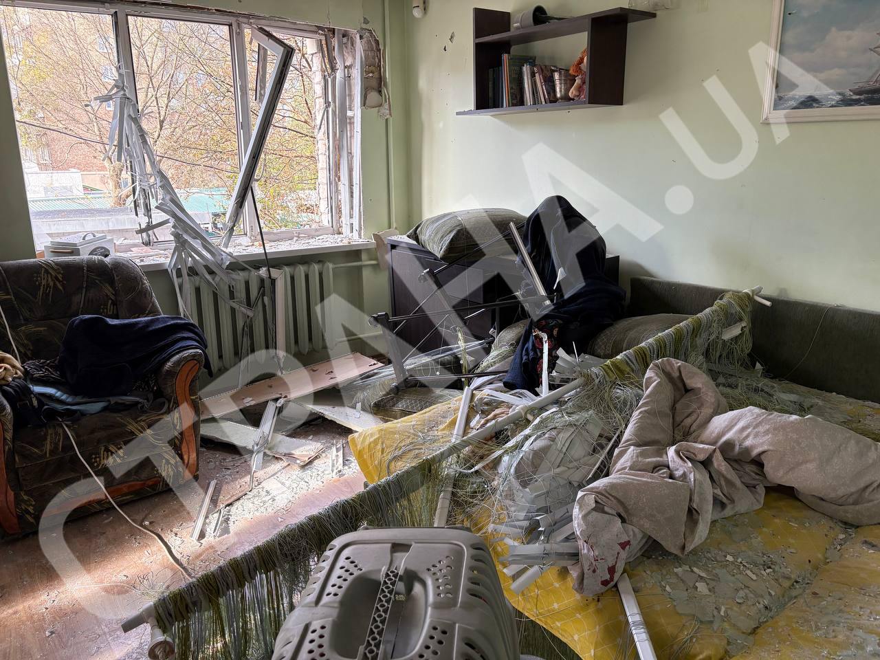 10.11 Кадри однієї з найбільш пошкоджених квартир у Києві після падіння уламків БПЛА. Вона знаходиться на другому поверсі.