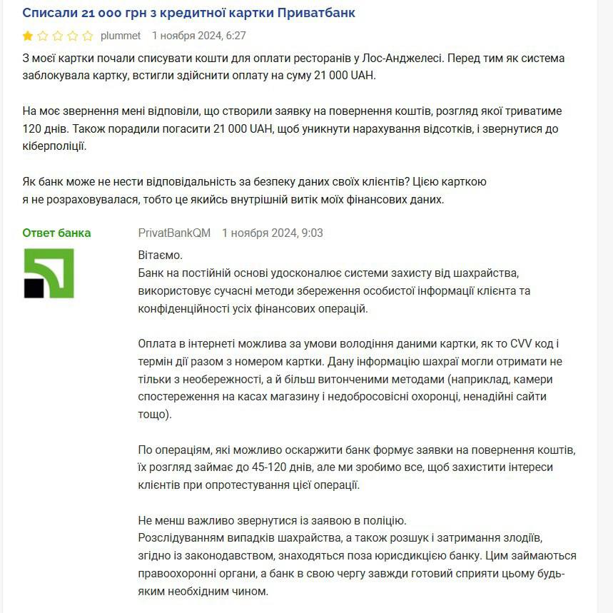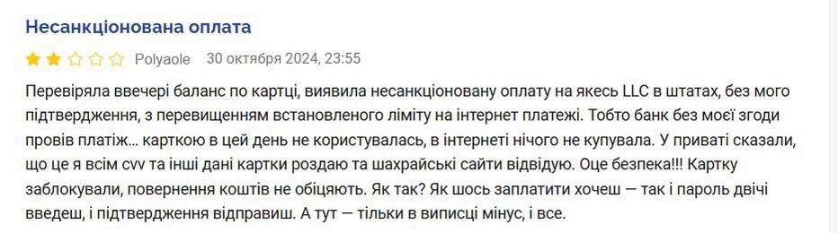 "Перевіряла ввечері баланс за карткою, виявила несанкціоновану оплату на якесь LLC у Штатах, без мого підтвердження, з перевищенням встановленого ліміту на інтернет платежі. Тобто банк без моєї згоди провів платіж", - каже клієнт Приватбанку під ніком Polyaole.
