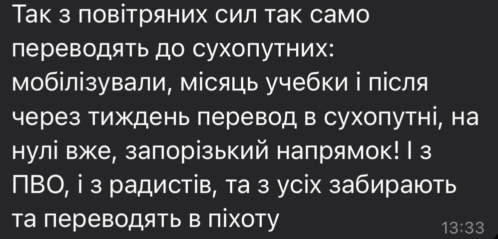 "З повітряних сил так само переводять у сухопутні: мобілізували, місяць навчання і після через тиждень переведення в сухопутні, на нулі вже, запорізький напрямок. І з ППО, і радистів, та всіх забирають