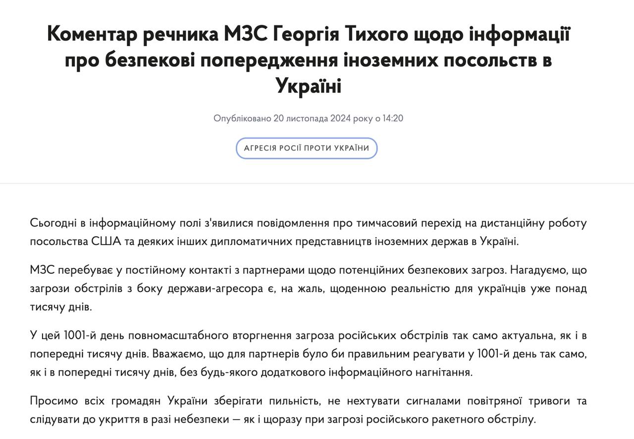 А МЗС прокоментувало дописи посольств західних країн про загрозу масштабного обстрілу України сьогодні, назвавши їх "інформаційним нагнітанням".