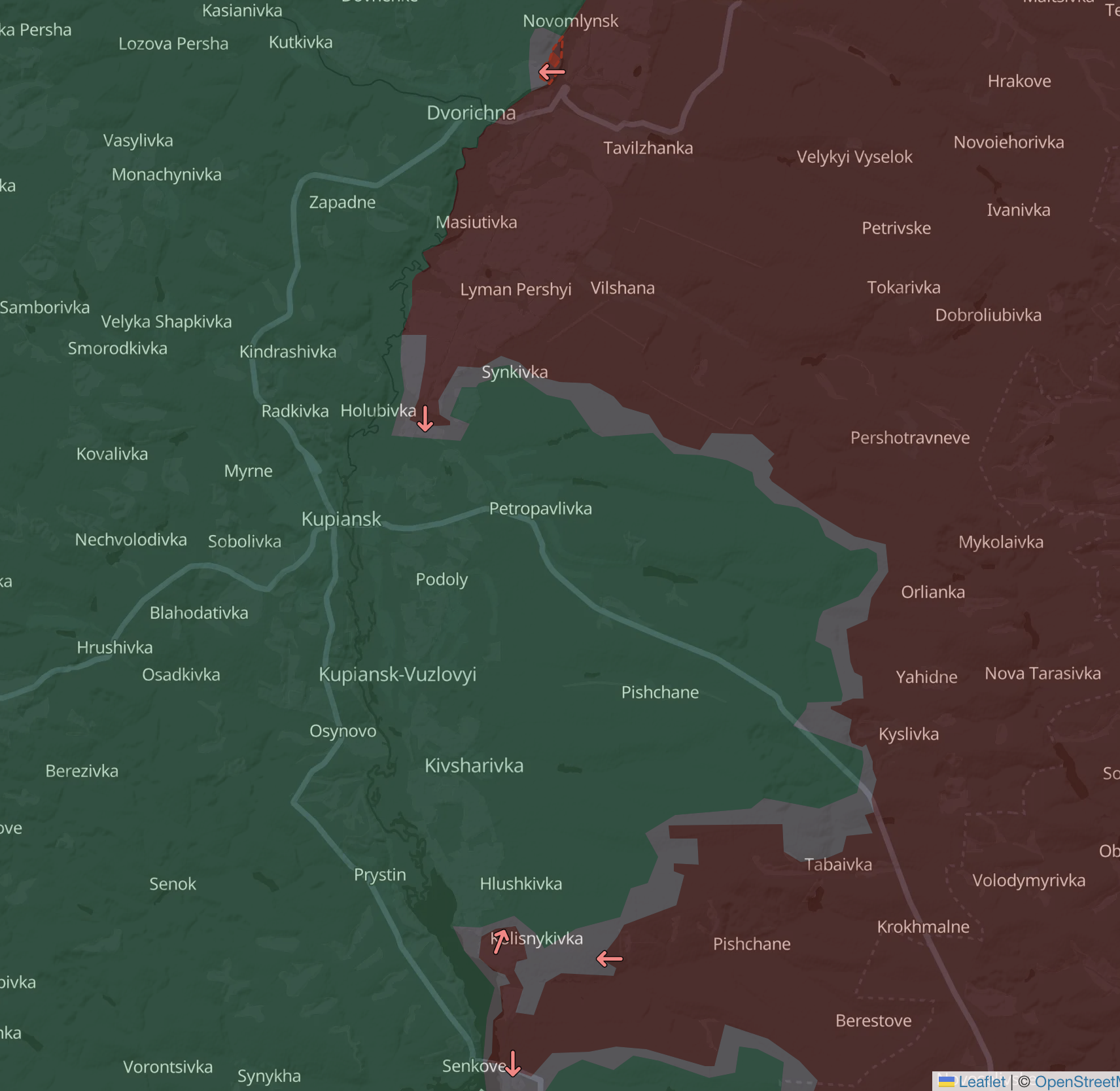 На Куп'янському напрямі, за словами журналіста, бої точаться уже біля Новоосинового, що означає часткову або повну втрату Україною Глушківки. Також він повідомив, що стискається обручка навколо самого Куп'янська: так, росіяни вже підійшли до Петропавлівки, яка прикриває лівобережну частину міста (при цьому Deep State наближення до Петропавлівки поки що не підтверджує).