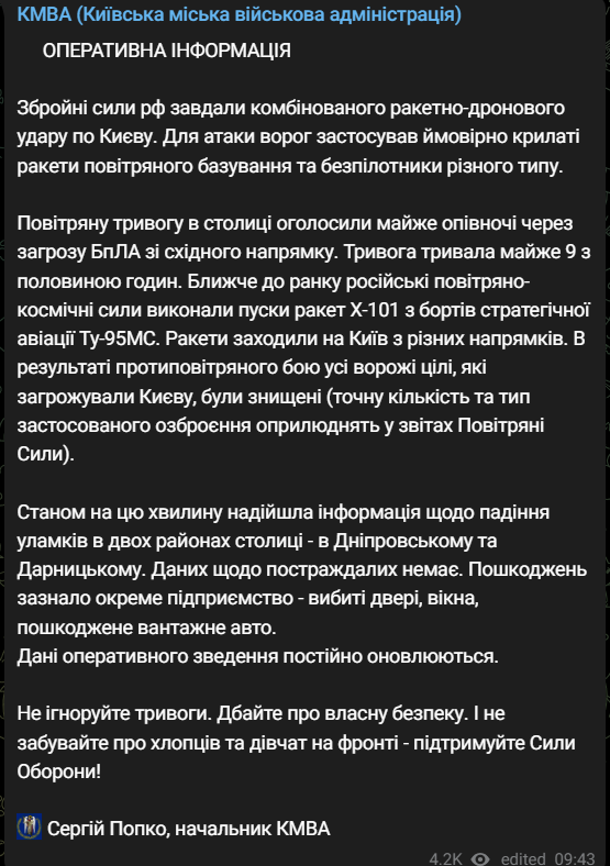 Тривога тривала майже 9,5 години. Ближче до ранку російські повітряно-космічні сили виконали пуск ракет Х-101 з бортів стратегічної авіації Ту-95МС.