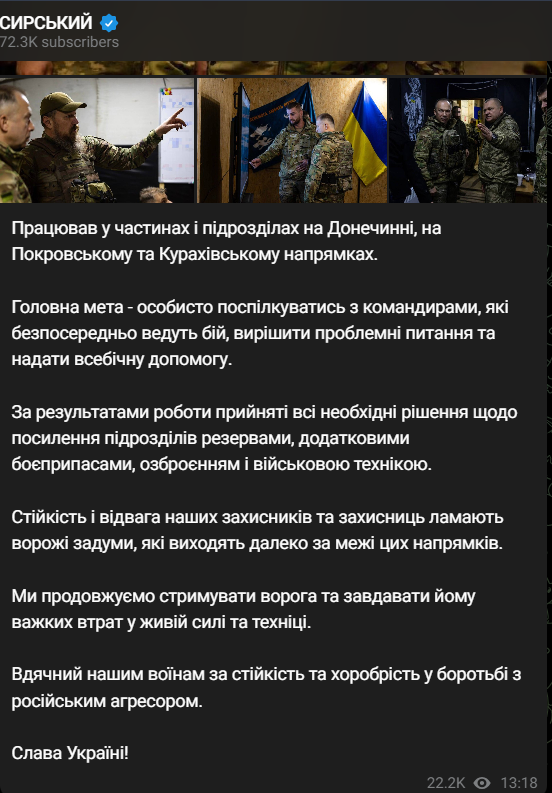 "За результатами роботи прийнято всі необхідні рішення щодо посилення підрозділів резервами, додатковими боєприпасами, озброєнням та військовою технікою", - пише Сирський.