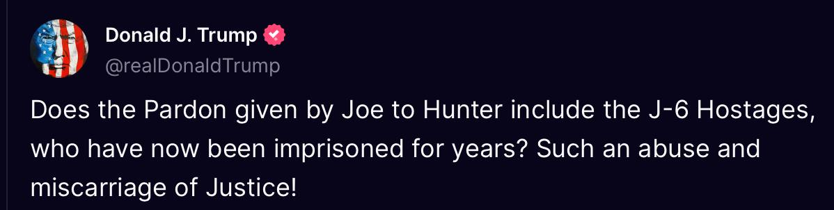 "Чи поширюється помилування, дане Джо Хантеру, на заручників 6 січня (звинувачених у штурмі Капітолію 6 січня 2021 року - Ред. ), які вже багато років ув'язнені? Таке зловживання та порушення правосуддя!" - написав Трамп у соцмережі Truth.