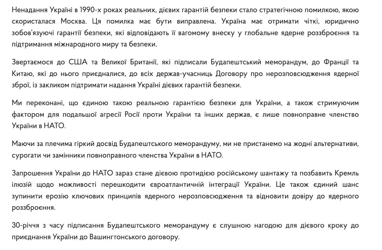 Україна звертається із закликом запросити її до Альянсу до США та Великобританії, які підписали Будапештський меморандум, Франції та Китаю, які до нього приєдналися, а також до всіх держав-учасниць Договору про нерозповсюдження ядерної зброї.