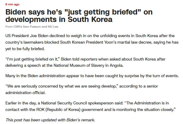 Джо Байден, який зараз перебуває з візитом в Анголі, невиразно прокоментував заяву президента Південної Кореї Юн Сок Йоля про введення воєнного стану.
