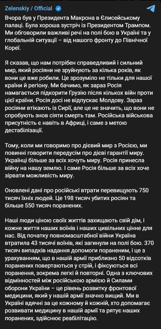 "Я сказав, що нам потрібен справедливий і сильний світ, який росіяни не зруйнують через кілька років, як вони це вже робили. Тому, коли ми говоримо про дієвий мир з Росією, ми маємо говорити насамперед про дієві гарантії миру", - заявив Зеленський.