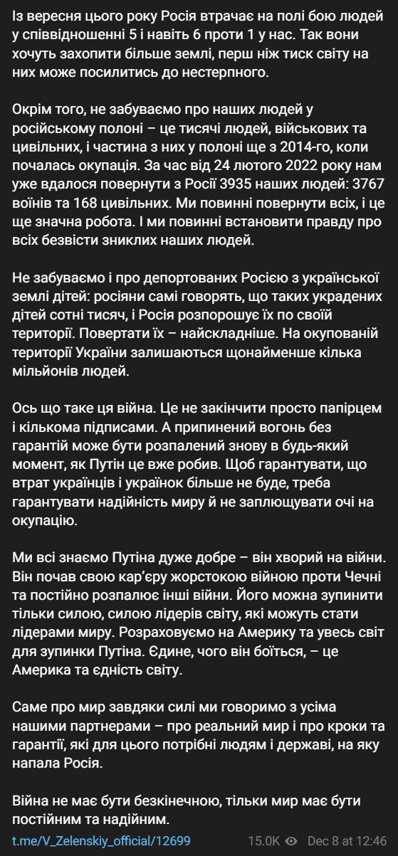 "Припинений вогонь без гарантій може бути розпалений знову будь-якої миті, як Путін це вже робив. Щоб гарантувати, що втрат українців та українок більше не буде, потрібно гарантувати надійність світу і не заплющувати очі на окупацію", - написав Зеленський.