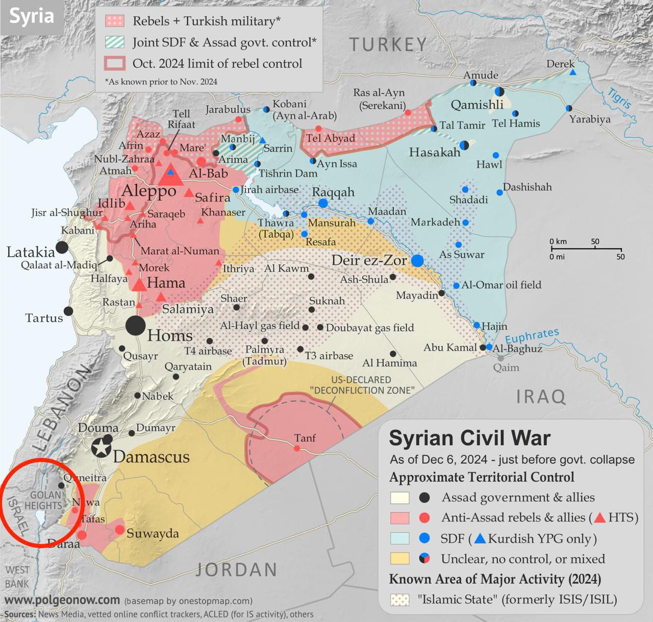 Поки протурецькі формування намагаються взяти під контроль північну та центральну частини Сирії, вступаючи у бої з курдами, із південного заходу до країни увійшли ізраїльські війська.Як уже повідомляла влада Ізраїлю, вони захопили буферну зону в раніше контрольованих Сирією районах Голанських висот. Західна частина цих висот контролюється Ізраїлем ще з 1967 року.