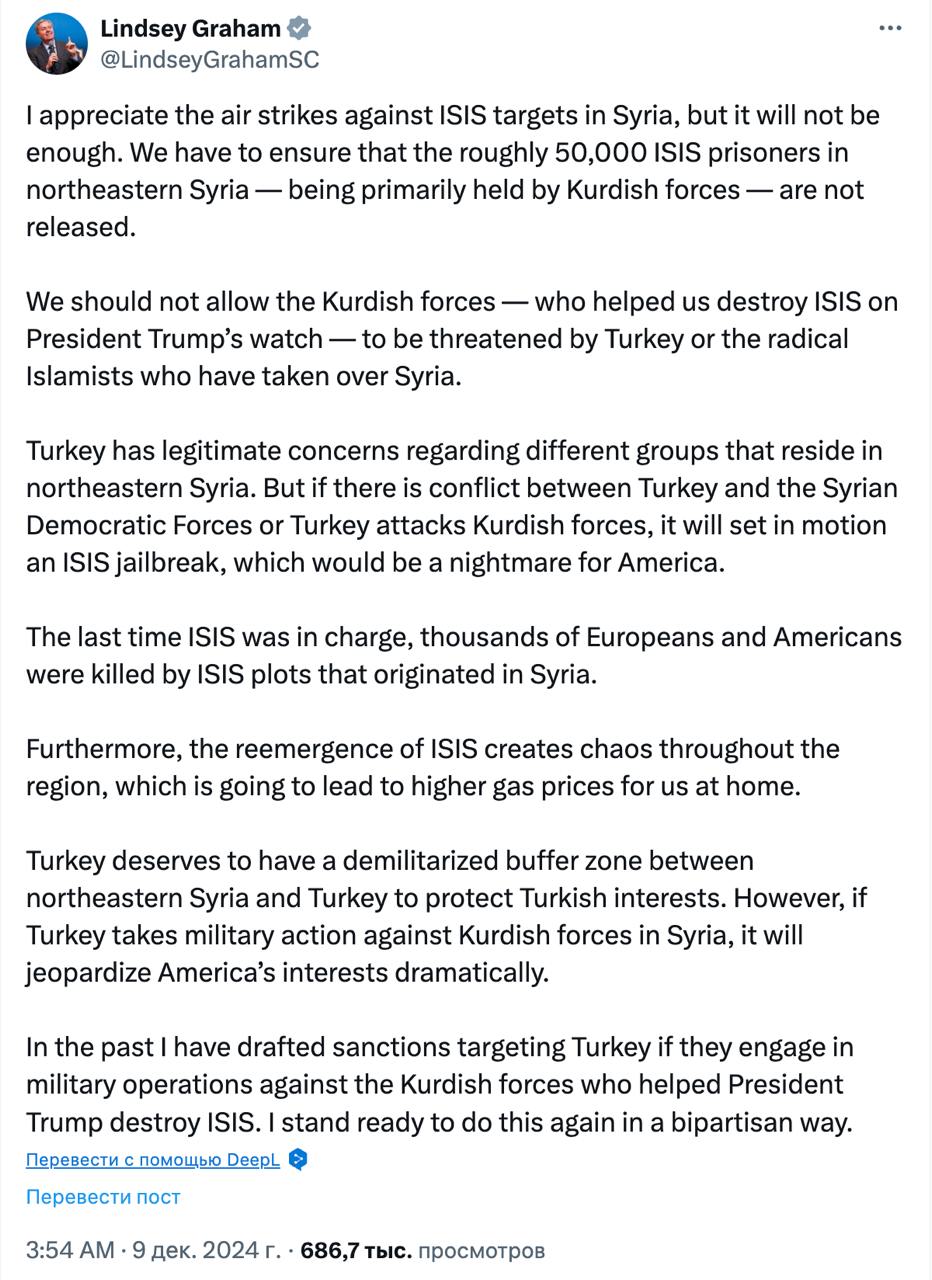 "Якщо Туреччина здійснить військові дії проти курдських сил у Сирії, це різко поставить під загрозу інтереси Америки. У минулому я підготував проект санкцій проти Туреччини, якщо вона розпочне військові дії проти курдських сил, які допомогли президенту Трампу знищити ІДІЛ. Я готовий зробити це знову у двопартійному порядку", - пише Грем.