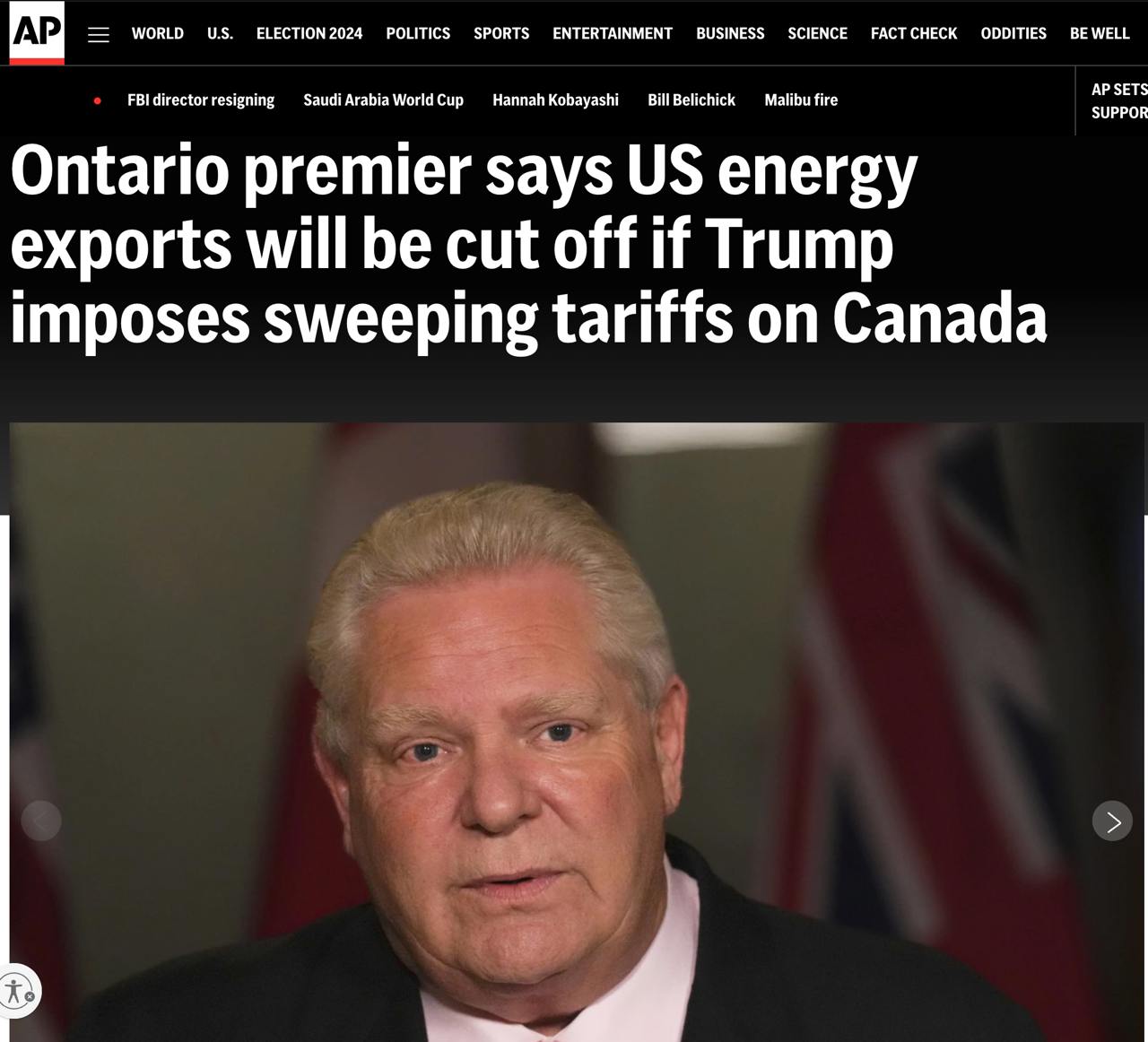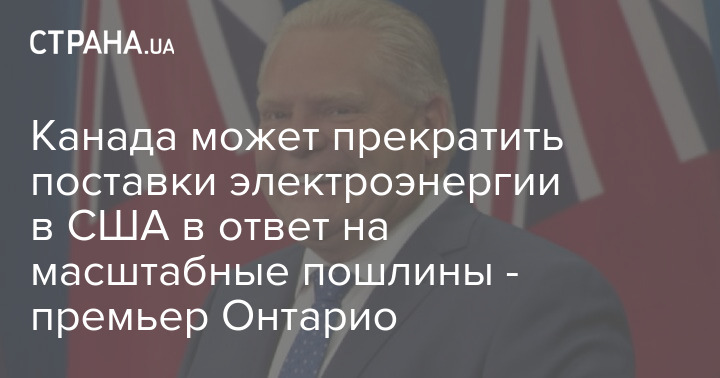 Прем'єр Онтаріо, найгустонаселенішої провінції Канади, Даг Форд заявив, що припинить постачання електроенергії до США, якщо новообраний президент США Дональд Трамп запровадить, як обіцяє, масштабне мито на канадську продукцію.