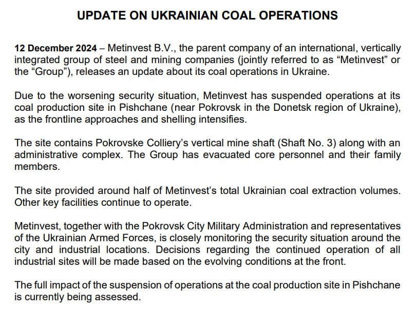 Інші об'єкти компанії у Покровську продовжують працювати. Джерело в "Метінвесті" уточнило агентству Reuters, що, як і раніше, діють дві інші шахти, розташовані далі від лінії фронту.